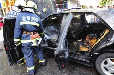 昨天下午4点10分,出事车辆斜停在辅路上,消防员正在车体起火处喷水。约15分钟后,灭火完毕,车前盖内的配件已是一片漆黑,消防员打开车门查看时,发现车内坐垫等物已被烧焦。