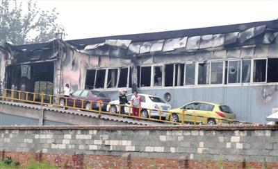 4S店的维修车间被烧毁,消防员正在现场处理。王苡萱摄