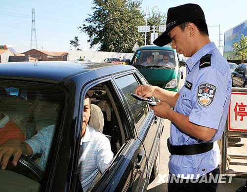 9月15日,民警在白庙综合检查站对进京车辆进行安全检查。当日零时,北京警方启动一级巡控方案,至10月8日,进出京近200个主要路口和各治安检查站逢车必查。新华社发(谭志勇 摄)