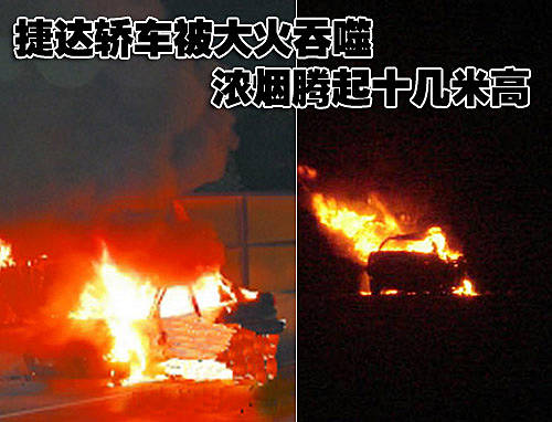 捷达轿车自燃时有两名好心司机用自己车上的灭火器扑救,但火势蔓延速度较快,他们只能等待消防官兵的到来。消防队员刚到后约5分钟,将大火彻底被扑灭。而此时的捷达车整个车身被烧得面目全非,只剩下一副铁架子。