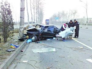 本报讯 今晨6时许,京津高速张家湾开发区张辛庄路口往东300米处,一辆黑色桑塔纳撞上路边大树,被困车内的司机当场身亡。
