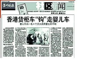 ●4月25日,深圳市龙岗区南湾街道发生一宗货柜车拖挂婴儿车肇事逃逸案件。被拖婴儿下落不明,生死难料。