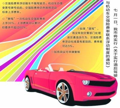 根据昨日省公安厅印发《关于实行酒后驾驶与机动车交强险费率联系浮动制度的通知》表明,交强险费率与酒后驾驶交通违法行为相联系的浮动标准已经明确,交强险费率浮动随车不随驾驶员。记者从市交警支队获悉,7月1日起,我市将开始实施。