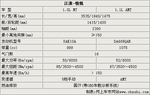 江淮悦悦将搭载两款发动机,1.0升车型将匹配五速手动变速箱,1.1升车型将匹配AMT变速箱。通过这两款发动机的详细参数显示,这款车型的动力性能并没有太大的差距,但这两款发动机都采用哈飞的动力引擎,在经济性方面会有不错的表现。