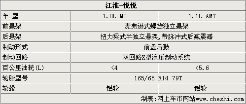 在底盘方面,江淮悦悦的前悬架采用麦弗逊式独立悬架,后悬架为扭力梁式半独立悬架。制动系统则采用前盘后鼓式,并采用双回路X型液压制动系统。另外,悦悦两款排量的新车都采用全铝轮毂,并采用165/65 R16尺寸的轮胎。