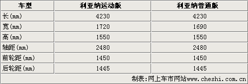 昌河铃木利亚纳运动版的车身尺寸与老款相比并没有过多的变化,轴距、前后轮距与普通车型没有分毫不同,整车长度和车身高度也没有任何变化。但新利亚纳的车身采用加宽处理,车身宽度增加了30毫米,达到了1720毫米。由于轴距长短和车身高度没有变化,加宽的车身恐怕也不能给全新利亚纳带来更好的内部空间,只是在外形上有相应的改变。