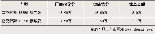 随着雷克萨斯ES240的即将引进,雷克萨斯ES系列的入门价格被放低,同时也加大了与同级车型的竞争力度,并且据我走访多家北京雷克萨斯经销店获知,目前在售的雷克萨斯ES350的两款车型均有现金优惠。雷克萨斯ES350标准版售价48.9万元,经2.9万元的优惠后售价降到了46万元,雷克萨斯ES350豪华版的售价为57.2万元,经3.7万元的优惠后售价降到了53.5万元。