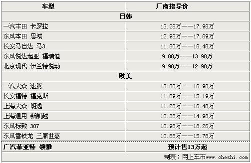 目前国内的A级车市场竞争非常激烈,而近期又有多款新车上市销售,如:三厢世嘉、福瑞迪等。菲亚特Linea领雅以进口方式引入国内销售的售价为17.1万-18.6万,菲亚特与广汽合作生产这款车型之后,其售价也必然会有所调整,而广汽菲亚特的定价策略也会参考主要的竞争对手,如:速腾。目前一汽大众速腾的厂商指导价为13.88万——16.98万元,因此我们预计搭载1.4T发动机的国产Linea领雅售价将在13万以上。