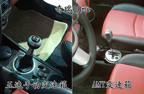 奇瑞QQme AMT车型的主要变化,是采用的奇瑞公司自主研发的手自一体五档变速器,是配备了有电子液压控制单元的机械变速箱,让驾驶员不需要控制离合器踏板和进行传统的手动换档控制。该自动变速箱有三种操作模式:手动换档;自动经济换档和自动普通换档。