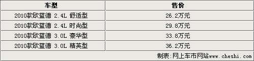 2010款三菱欧蓝德共推出四款车型,分为2.4L和3.0L两种排量,其中2.4L舒适型为两驱版,售价26.2万元。其他三款车型均为四驱版,售价29.8万元、33.8万元和36.2万元。据悉,目前2010款欧蓝德只有少数展车到店,大部分车型现在都只能预订,大概需要七个工作日即可提车。