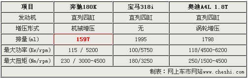 奔驰新C180K车型虽然仅搭载1.6升排量引擎,但其最大功率和扭矩却高达115Kw/5200和230Nm/3000-4500,较排量为2.0升的宝马318i分别高出15 Kw和50 Nm。由于奥迪A4L 1.8T搭载了1.8升燃油直喷涡轮增压引擎,所以最大功率和扭矩位居三款入门级车型之首。