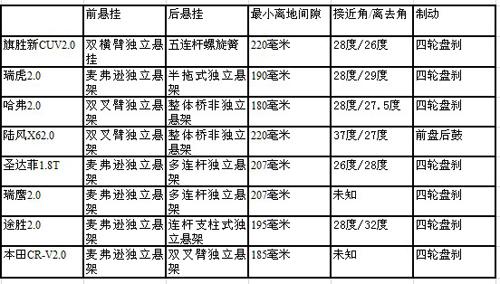 SUV车主要的任务不是去真正的越野探险,在提供舒适的前提下,它只需具备一定的通过能力,从这些SUV车的悬挂就能看出这一点。在这一点上,表格中的8款SUV车,除了陆风的X6在性能上偏向越野车之外,其余各款车型,均以追求舒适为主。