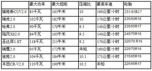 我们从厂家了解到,新旗胜已经全面上市,动力分为2.0升和2.4升两个系列,分为两驱和四驱共6个车型。外形看,这是一款颇为漂亮的车子,外形、做工和配置,与其售价很是不符。为了让大家对其有所了解,这里把新旗胜和同级的几款自主品牌SUV以及小一个级的SUV(比如瑞虎)做一番简单对比。为了参考的更全面,还把包括本田CR-V在内的几款合资车同时排列,尽管它们所面对的,并非同一个市场,特别是像本田这样的车型,与自主品牌相比,品牌价值差异较大,不能做直接对比,只能是个参考。
