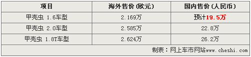 甲壳虫在海外市场配备1.6、2.0和1.8T三个排量的多款车型,而甲壳虫1.6作为入门级车型,其售价也最便宜。目前甲壳虫在国内仅有2.0和1.8T两个排量,虽然厂家指导价为22.8万和26.2万,但实际市场售价均可优惠3万元左右。通过国内外相同排量车型的售价可以看出,甲壳虫1.6引入国内的售价预计为19.5万元左右。