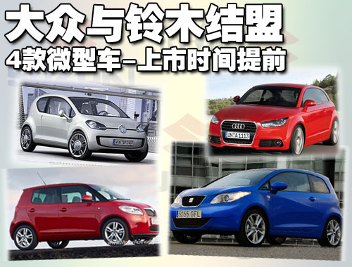奥迪A2将在2011年正式上市,其中包括扩3门和5门版、跑车版、敞篷版,大众品牌将在2012年推出全新一代微型车UP。为了能在未来的价格竞争中获得优势,大众将为UP系列微型车开发包括全新设计的小排量发动机(1.0升及以下)、全新开发的手动/自动变速器在内的一系列配套零部件。作为UP计划的一个重要组成部分,大众需要在短时间内开发出1.0升/0.8升甚至0.6升多款全新发动机,而大众在1.0升以下排量发动机方面的技术储备几乎为零。与铃木的联盟将完全解决这些问题,微型车上市时间将提前。
