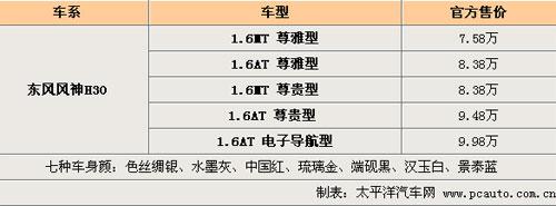 1月27日,备受期待的东风风神首款精品两厢车东风风神H30,以“从容进取、自由人生”为产品主张,在“自由之都”——成都拉开了全国自由上市帷幕。东风汽车公司副总经理、东风乘用车公司总经理李绍烛公布了东风风神H30五款上市车型的价格:1.6MT尊雅型7.58万元,1.6MT尊贵型8.38万元,1.6AT尊雅型8.38万元,1.6AT尊贵型9.48万元,1.6AT 电子导航型9.98万元。