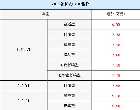 今日,长安汽车旗下两厢新车CX30正式上市,此次上市的共两个排量9款车型,其中包括低碳弱混合动力车型,售价区间为6.88-9.98万元。具体的车型售价请见下表: