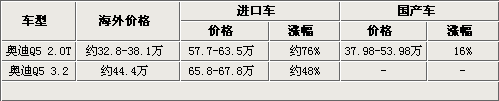 从以上表格中我们可以看到,奥迪Q5在海外的售价约合人民币32.8-44.4万元,旗下的2.0TFSI和3.2FSI车型以进口的形式进入国内后,价格分别有了76%和48%的涨幅。但随后奥迪Q5选择了国产,以此来降低奥迪Q5的成本和价格。我们看到,国产后的奥迪Q5价格涨幅只有16%,比进口车型下降了很多。