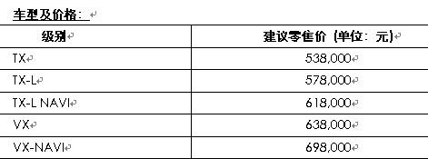 作为旧款VX级别车型的延续,TX-L级别配置更加丰富,采用4.0L双VVT-i的发动机,性能大幅提升。除沿用了旧款VX级别所配备的主动牵引力控制系统A-TRC以及车辆稳定控制系统VSC外,还增加了第三排座椅电动折叠功能、智能钥匙及一键启动系统、自发光式仪表盘等,同时,SRS空气囊也增至7个。在这种配置下,TX-L级别的价格设定为57.8万元,比旧款VX级别的价格还低7千元。