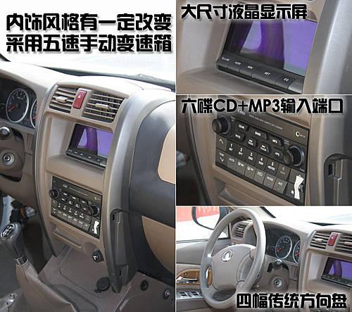 哈弗H5的内饰也比较符合长城汽车SUV产品的设计风格,中央控制区仍然是方方正正的造型。不得不说的是,哈弗H5内饰的用料依然显得塑料感太强。但这款车的内部配置却非常齐全,不仅配备了六碟CD和MP3输入端口,还配备了大尺寸液晶显示屏。哈弗H5采用的四幅式方向盘显得比较简单,没有音响按键和定速巡航功能。