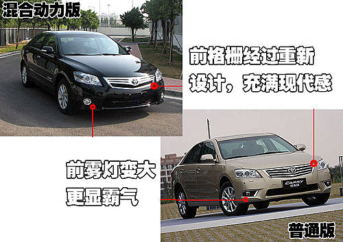 这款混合动力版凯美瑞的整体造型与普通版凯美瑞相同,但前脸部分设计变得更加前卫,犹如飞翔的翅膀。混合动力凯美瑞采用了圆形前雾灯,加大的设计不仅使整车显得更为霸气,而且更突出的前进气隔栅。