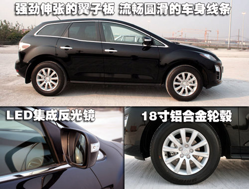强劲有力的翼子板在车身中部得以适量的过度,其在车尾部再次伸张,配以车窗周围的镀铬装饰条,赋予了CX-7更为前卫的定义。车身整体线条设计流畅圆润,反光镜集成了LED转向灯,最为显眼的当属轮毂,CX-7装配了18寸多幅铝轮毂,并配备了普利司通高级轮胎,为高速稳定性及驾驶安全性起到了关键作用。