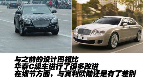 与之前曝光的华泰B级车设计草图相比,这款新车的实车确实有了很多改变,除了前脸仍与宾利非常相似以外,车身的很多细节部分的设计都有了全新的变化。如果说吉利卓越GE与劳斯劳斯幻影的相似度能达到80%,那么华泰的B级车山寨宾利欧陆飞驰则显得小巫见大巫了。