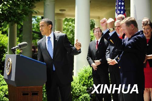 5月19日,美国总统奥巴马在首都华盛顿白宫玫瑰园发表讲话,福特汽车公司首席执行官阿兰·穆拉利(前右)在一旁举手欢呼。当日,奥巴马宣布一项新的针对小型汽车和轻型卡车的排放标准和油耗标准,该标准将于2012年起开始实施。根据要求,到2016年小型汽车和轻型卡车的平均能耗将达到每加仑汽油行驶35.5英里(即每100公里耗油约8升)。 新华社记者张岩摄