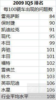JD Power的2009年研究,访谈超过了80900名买家,关于他们头三个月的使用情况,共提问228个问题,这项研究从2月进行到5月。这项研究共包括了37个品牌,基于2009款车型,统计在头90天内被车主发现的质量问题。