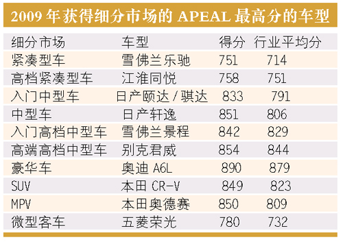 从J.D. Power的研究数据中可以看到,车主对新车性能和设计的总体满意度进步不明显:2009年,APEAL平均得分为799分(总分为1000 分),而2007年和2008年的分数分别为797分和800分,三年来几乎没有变化。