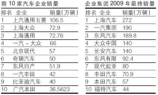前四位座次毫无悬念的由上汽和一汽的四大合资企业收得。紧随其后的是大幅跃升的北京现代,在提前40天完成销量目标之后,北京现代去年全年总销售达到57万辆,同比激增93.6%,较目标值50万辆提高了14.1%。奇瑞2009年全年销量超50万辆,创造了自主品牌年度销量新纪录,其排名也上升至第六位。