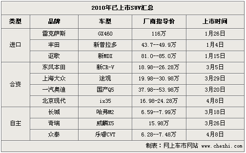 从年初至今,已经上市的SUV车型达到了10款之多,而3月上市的就占到5款。其中上海大众途观在上市预售首月订单就突破了4万辆的;随后上市的国产奥迪Q5订单已经排到明年,目前购买这两款车仍需要加2.5万-3万元才能提到现车。而4月8日上市的iX35则又将在日系车市场掀起一股抢购热潮。