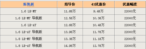 笔者日前走访北京上海通用4S店时获悉,目前新凯越优惠再升2000元,达到了最高2.2万元的让利,这也是去年以来最高的优惠记录。由于现在新凯越库存车较多,颜色齐全,对这款车感兴趣的消费者近期可以出手了。