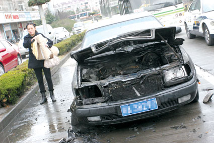 下了车后,谢先生急切地想知道发生了什么,使劲拉了拉发动机舱盖,就是打不开。两分钟后,车子燃起了大火,周围已是浓烟滚滚。“有人拿来了4个灭火器,对着车子直喷,不过火势太大了,根本灭不了。”谢先生说,看着自己的车子一点点地被大火吞噬,他简直欲哭无泪。最后消防队赶到了现场,才把大火扑灭。