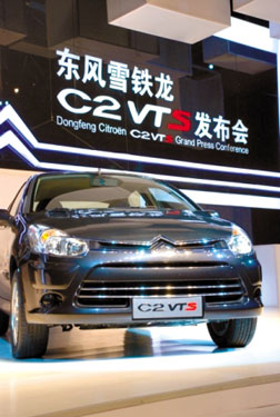 在东风标致推出206运动版没有多久,孪生兄弟东风雪铁龙也不敢落后。9日,东风雪铁龙C2 VTS新车(“Vitality Trendy Sporty” 的缩写,代表着:活力、时尚,也就是外界俗称的运动款C2)正式发布,C2 VTS延续了C2活力与时尚的产品定位,进一步丰富了C2的产品系列。东风雪铁龙总经理穆懿夫在接受本报专访时透露,VTS已经陆续发往各大专卖店,他希望VTS能占到C2总销量的四成左右。目前C2单月的销量在1000辆左右,VTS的推出有可能带领C2迈过1500辆大关。