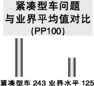 在细分市场方面,紧凑型车车主遇到的问题比行业平均水平高出80%以上,比高档紧凑型车用户的问题高出58%。几乎20%的紧凑型车车主都投诉说他们遇到的问题比预期的要多,而整个业界有此抱怨的客户也不过是10%。除此之外,紧凑型车细分市场中遇到的产品缺陷和功能障碍数量(243 PP100)几乎是业界总体水平的两倍(125 PP100)。