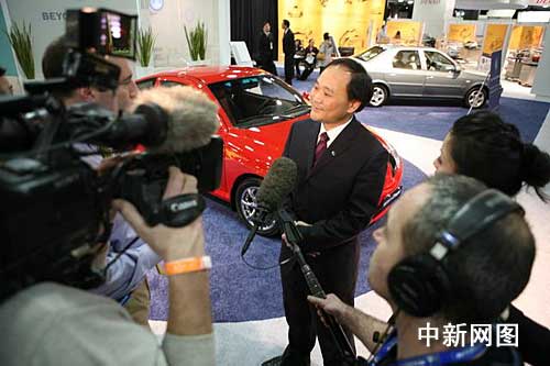吉利集团董事长李书福在北美车展现场接受中外媒体采访