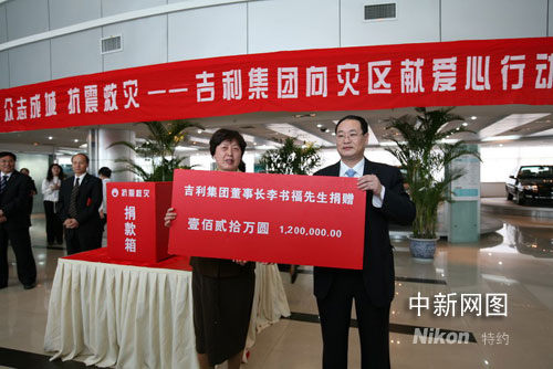 中新网5月14日电 5月12日汶川巨震,震动全国。吉利集团在第一时间展开了专题会议,联合开展捐车、捐钱、献血活动,携经销商、供应商首批捐款突破千万。其中吉利集团董事长李书福当场个人捐款120万元,四川省驻浙办事处领导参加并接受了吉利对灾区的捐款。