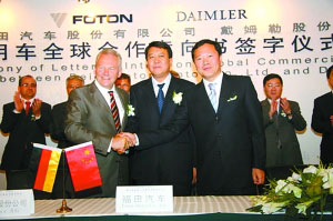 福田与戴姆勒长达5年的合资之路终于修成正果。8月7日,福田汽车与戴姆勒公司在京签订了合作意向书,双方将以50:50的对等出资形式在中国成立一家中重卡合资公司。奔驰将导入中重卡技术及重型发动机,今后新合资公司将生产福田欧曼品牌重卡,并纳入奔驰全球商用车品牌体系,借用奔驰全球网络开拓海外市场。