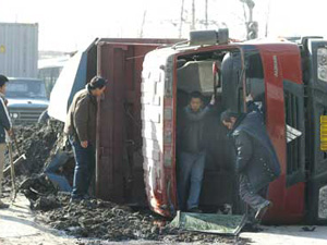 中新网1月31日电 据北京娱乐信报报道,昨日(1月30日)11时40分左右,北京东五环环铁桥下,一辆满载泥土的福田大货在拐弯时突然侧翻,撒出的泥土将路边一骑车女子连人带车掩埋,女子扒土而出后被送往医院,货车男司机从前挡风玻璃处爬出,所幸两人均没有受伤。