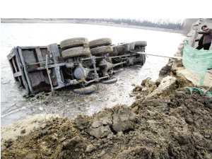 昨天(2月8日)凌晨,北京望京南湖物业管理中心垂钓中心北岸边,一辆大货车停在岸边,正在往车厢内装土时,河岸突然塌陷,大货车翻进了已经结冰的河中。所幸事发时货车司机并不在车上。(记者:甄宏戈、易靖)