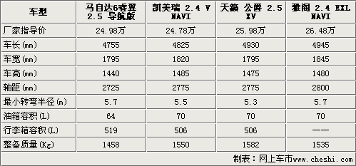 我们选取的四款车型都是位于该车系中的顶配车型,售价都在25万元左右,马自达6睿翼在这四款车型中属于售价比较低的。在车身尺寸方面马自达6睿翼是4款车型中最小的,同时在轴距方面也只有2725mm,这意味马自达6睿翼在这四款车型中的内部尺寸应该是最小的。雅阁的轴距是四款车型最大的,达到了2800mm,保证了雅阁内部空间的宽敞。凯美瑞和天籁•公爵都同时拥有2775mm的轴距,它们在内部空间上将不会有太大的差距。四款车型中除了马自达6睿翼外其余三款车型均达到了70升。由于马自达6睿翼身材较小,所以在整车质量方面它也是4款车型中最轻的。