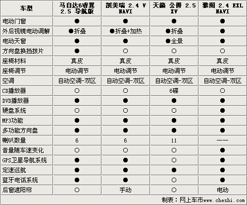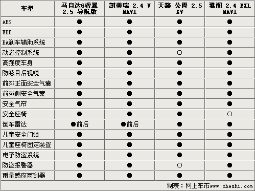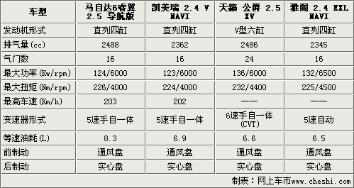 通过上述描述,相信您对这四款车型有了一个大致的了解。马自达6睿翼外观设计较为时尚,安全性能突出,具有较高的性价比。新雅阁拥有大气的外观,全面的配置绝对能够满足大多数公务用途。凯美瑞在市场上有着绝对的号召力和保有量,消费者对它的反应更是有口皆碑的,是一款不折不扣的全能车型。而天籁•公爵则拥有出色的动力性能。四款车可以说是各有各的特点和优势,至于最终的选择还要看消费者的实际需求了。 (李晓磊)