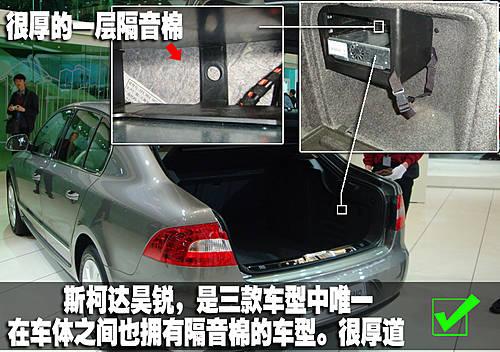 打开行李箱后我们通常可以在一些“隐蔽”的地方发现一台车的细节做工,例如这部分对比中您将看到斯柯达-昊锐在三款车型中独有的“车辆内侧隔音棉”。