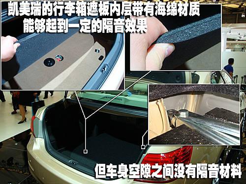 我们看到凯美瑞的行李箱与备胎之间的盖板上设计了非常厚的一层隔音材料,这部分设计能够较好的实现阻隔行驶中噪音的作用。但是在行李箱内部覆盖件与车身之间我们同样没有看到任何隔音材料的填充。