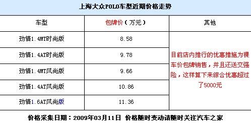近期小型车市场可以说是大事不断,峰范、嘉年华的先后上市都对这一市场的格局造成了一定的影响,而作为这一系列的主力车型之一的POLO车型也不甘示弱。近期,笔者通过深圳地区的上海大众经销商处了解到,目前POLO 劲情车型在深圳地区的优惠措施为裸车价包牌销售,即相当于免除了购置税、上牌费等一系列费用,并且还送交强险。具体详情请见下表: