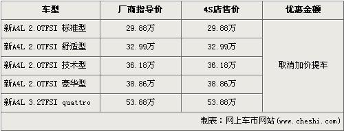 奥迪新A4L自从广州车展发布以来受到众多消费者关注,全新的泪眼设计外观再加上多项高科技安全配置使这款车在同级别车中更凸显出奥迪一贯的品质。记者最近从北京地区奥迪经销商处了解,目前新A4L新车取消了加价提车,具体车型价格如下: