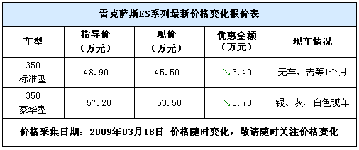 本周,编者联系了上海和凌雷克萨斯4S店后了解到,现在该店雷克萨斯ES350有现车在售,可选车型仅为豪华型一款,现车有银色,灰色和白色可选,标准款车型需提前1个月预定。价格方面,目前购买ES350最高可优惠3.7万元,店方还有部分礼品相赠,详细价格信息请见下表: