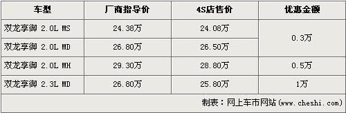 凭越野车起家的双龙,向来是以生产SUV而著称的,旗下的双龙享御更是其的代表之作,其2.0L车型搭载的柴油发动机更是源于奔驰的技术。双龙享御共有四款车型,售价区间为24.38万元-29.30万元。近日根据网上车市价格监测显示,双龙享御全系最高优惠1万元,详情请看下表: