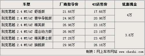 笔者从别克北京地区经销商处了解到,目前君越全系优惠幅度有一定幅度的变化,最高优惠可达到4万元左右,如果到4S店看车的话还有一定区间优惠。君越2.4精英版,旗舰版等车型则优惠3.8万元。君越现车一直以黑色为主,其他款需要消费者预订。